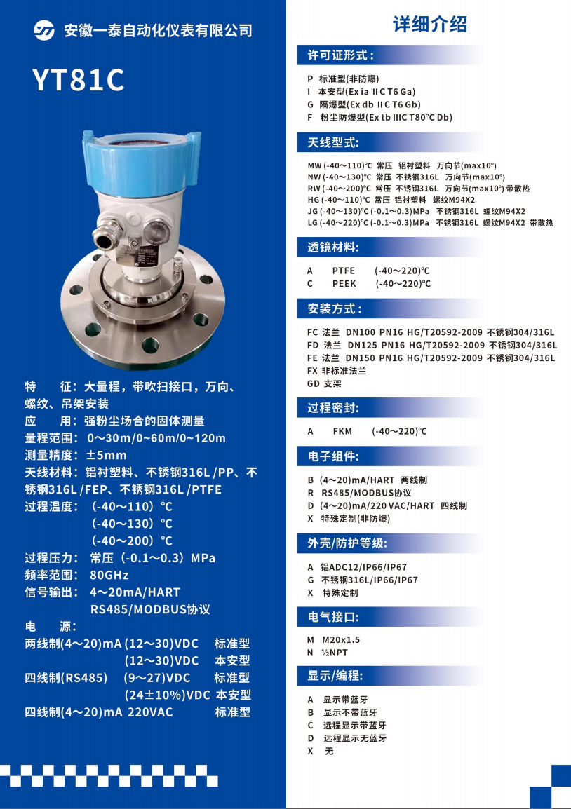 天线材料:铝衬塑料、不锈钢316L/PP、不 锈钢316L/FEP、不锈钢316L/PTFE